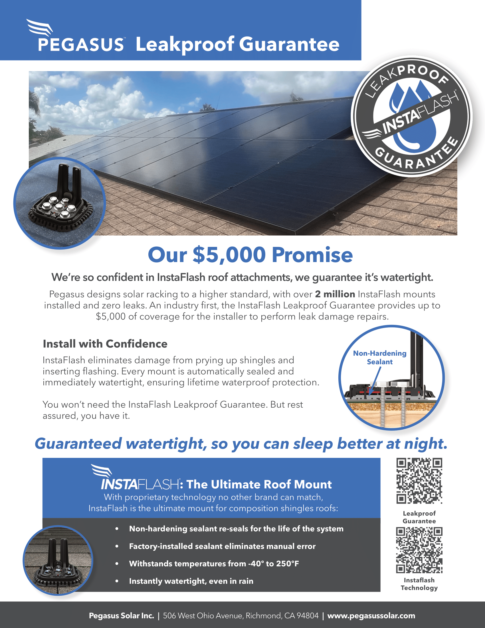 For solar projects where Pegasus’ InstaFlash and InstaFlash2 products are installed to a roof surface using Pegasus’ fasteners (together “InstaFlash Products”), Pegasus will reimburse up to $5000 in costs per project for repairing building damage caused by one or more roof leaks when and only when a claim is properly submitted through Pegasus’ online design software, Glide (a “Leak Claim”). Building damage may include drywall replacement, carpet replacement, painting, mold remediation, or similar remediation and restoration activities. To qualify for reimbursement, the following must be met: